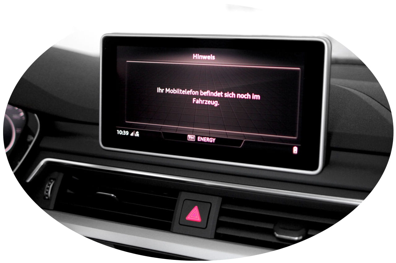 - Przy opuszczaniu pojazdu, pojawia się informacja o pozostawieniu telefonu, jeśli telefon komórkowy nadal znajduje się przy indukcji